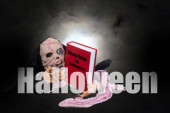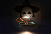 Strach na wróble w kapeluszu czarownicy z cieniem diabła na ciemnym niebie i błyskawicą w tle.