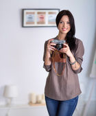 Kobieta jest profesjonalnym fotografem z aparatem fotograficznym