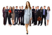 szczęśliwy młody biznes kobiety stojącej przed jej zespołu
