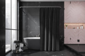 Narożnik kabiny prysznicowej wnętrze z ramą jednostki próżności, różowy obszar z niszową półką, lustro i trzy światła. Czarny marmur i płytki podłogowe. Koncepcja projektowania trendów. 3d renderowanie