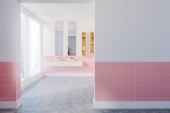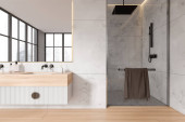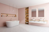 Zdjęcie "Narożnik kabiny prysznicowej wnętrze z ramą jednostki próżności, różowy obszar z niszową półką, lustro i trzy światła. Czarny marmur i płytki podłogowe. Koncepcja projektowania trendów. 3d renderowanie" może być wykorzystywane do celów osobistych i komercyjnych zgodnie z warunkami zakupionej licencji Royalty-free. Obraz jest dostępny do pobrania w jakości wysokiej rozdzielczości do 5760x3840.