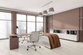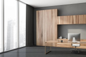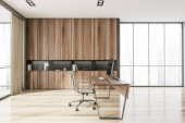 Ciemne drewniane wnętrze pokoju menedżera z czarnym stołem i pulpitem, dwa fotele ze stołem kawowym, parkiet. Okno z Moskwą. Pusta ściana, renderowanie 3D