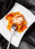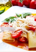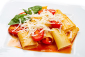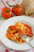 pierożki makaron z sosem pomidorowym czerwony
