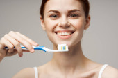 ładna kobieta ze szczoteczką do zębów w dłoni rano higiena lekkie tło