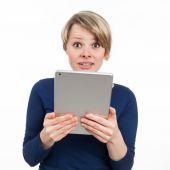 Zdjęcie "uśmiechający się tabletki, dotykając w szoku" może być wykorzystywane do celów osobistych i komercyjnych zgodnie z warunkami zakupionej licencji Royalty-free. Obraz jest dostępny do pobrania w jakości wysokiej rozdzielczości do 5760x3840.