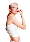 Zdjęcie "Portret seksownej Blondynki z truskawką" może być wykorzystywane do celów osobistych i komercyjnych zgodnie z warunkami zakupionej licencji Royalty-free. Obraz jest dostępny do pobrania w jakości wysokiej rozdzielczości do 5760x3840.