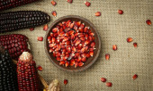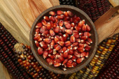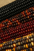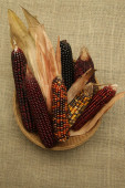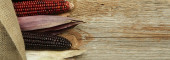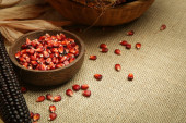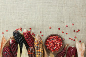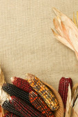 Dekoracyjna indyjska kukurydza na tle tkaniny yuta. Wielokolorowa kukurydza krzemienna.