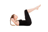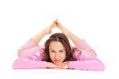 kobieta buźkę w piżamie niebieski, siedząc na podłodze