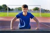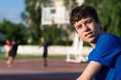 Facet siedzi na krawędzi boiska i ogląda mecz koszykówki.