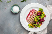 Zdjęcie "Świąteczna pieczona kaczka serwowana z sosem jagodowym i sałatką, tło przepis żywności. Zamknij się.." może być wykorzystywane do celów osobistych i komercyjnych zgodnie z warunkami zakupionej licencji Royalty-free. Obraz jest dostępny do pobrania w jakości wysokiej rozdzielczości do 5760x3840.