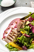 Świąteczna pieczona kaczka serwowana z sosem jagodowym i sałatką, tło przepis żywności. Zamknij się..