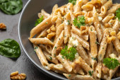 Makaron pełnoziarnisty Penne z sosem gorgonzola, szpinakiem i orzechem włoskim. Zdrowa żywność.