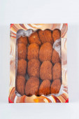 Piernik w szkliwie w przezroczystej torbie na białym tle. Rosyjskie narodowe pierniki. Piernik w opakowaniu z bliska