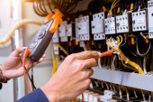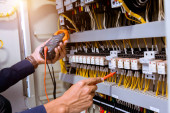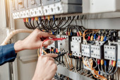 Elektrycy sprawdzają prąd elektryczny w panelu sterowania.