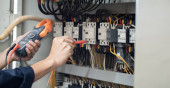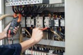 Elektryk inżynier pracy tester pomiaru napięcia i prądu linii elektrycznej w elekcyjnej szafie sterowania, koncepcja sprawdzić działanie systemu elektrycznego .