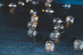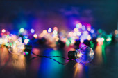 Serenevo-zielone żarówki z girlandy na zdjęciu z góry są ustawione w rzędzie.