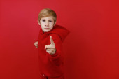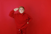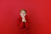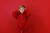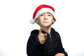 Chłopiec w czerwonym kapeluszu Mikołaja trzyma rękę na głowie i uderza w kapelusz.