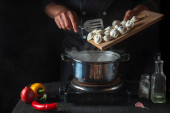 Zdjęcie "Profesjonalny kucharz przygotowuje pierogi w rondlu w kuchni restauracyjnej. Close-up - ręce kucharza dodać soli" może być wykorzystywane do celów osobistych i komercyjnych zgodnie z warunkami zakupionej licencji Royalty-free. Obraz jest dostępny do pobrania w jakości wysokiej rozdzielczości do 5760x3840.