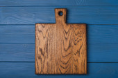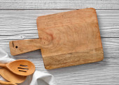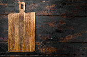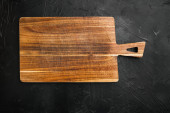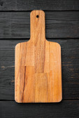 Bambus deska tnąca zestaw pusty do pustej przestrzeni do kopiowania tekstu lub żywności, widok z góry płaski leżak, na czarnym drewnianym tle tabeli
