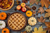 Wariant miniaturowych dyń na drewnianym stole. Koncepcja Dziękczynienia z małymi dyniami i liśćmi jesieni.