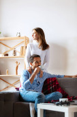 Zdjęcie "Szczęśliwa para spędzająca razem czas w domu, w domu. Młody mężczyzna i kobieta siedzą na kanapie. Pojęcie rodziny, związek" może być wykorzystywane do celów osobistych i komercyjnych zgodnie z warunkami zakupionej licencji Royalty-free. Obraz jest dostępny do pobrania w jakości wysokiej rozdzielczości do 5760x3840.