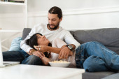 Szczęśliwa para spędzająca razem czas w domu, w domu. Młody mężczyzna i kobieta siedzą na kanapie. Pojęcie rodziny, związek