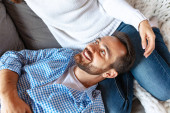 Szczęśliwa para spędzająca razem czas w domu, w domu. Młody mężczyzna i kobieta siedzą na kanapie. Pojęcie rodziny, związek