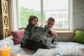 Zdjęcie "Szczęśliwa para spędzająca razem czas w domu, w domu. Młody mężczyzna i kobieta siedzą na kanapie. Pojęcie rodziny, związek" może być wykorzystywane do celów osobistych i komercyjnych zgodnie z warunkami zakupionej licencji Royalty-free. Obraz jest dostępny do pobrania w jakości wysokiej rozdzielczości do 5760x3840.