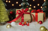 Piękne pudełka, bombki i choinka na tle światła bokeh.