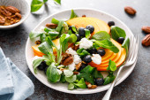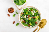 Zdjęcie "Sałatka ze szpinaku, gruszki, winogron, orzeszków ziemnych i gorgonzoli z sosem cytrynowym. Zdrowa żywność, dieta." może być wykorzystywane do celów osobistych i komercyjnych zgodnie z warunkami zakupionej licencji Royalty-free. Obraz jest dostępny do pobrania w jakości wysokiej rozdzielczości do 5760x3840.