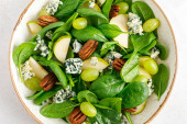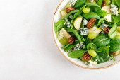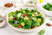 Sałatka ze szpinaku, gruszki, winogron, orzeszków ziemnych i gorgonzoli z sosem cytrynowym. Zdrowa żywność, dieta.