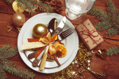 Zamknij piękne ustawienie stołu Bożego Narodzenia z dekoracjami