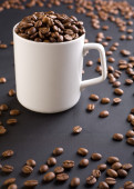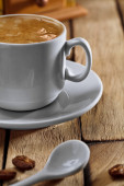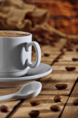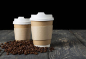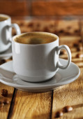 Gorąca świeżo parzona kawa aromatyzowana. Dwa klasyczne brązowe kubki. Na Vintage drewniane tło z ziaren kawy.
