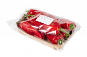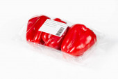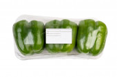 Żółta i czerwona papryka pakowana i etykietowana na białym tle