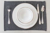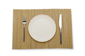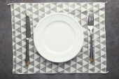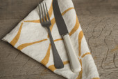 tabela ustawienia. beżowy płyta, widelec, nóż i beżowa serwetka lniana i Obrus.