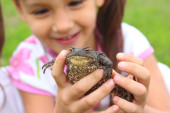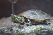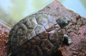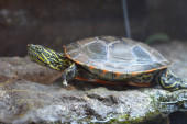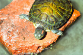 mężczyzna staw suwak lub żółw czerwonolicy linienia