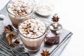 Kompozycja świąteczna z domowej roboty gorącą czekoladą. Zimowe kakao. Noworoczny drink. Nowy rok kompozycja z kakao. Przytulny drink