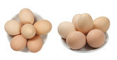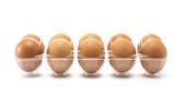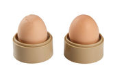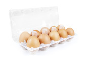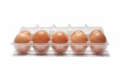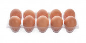 Uchwyt z tworzywa sztucznego z jajami ekologicznymi izolowanymi na białym tle.