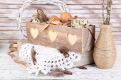 duży kosz okrągły z suszonej trawy i świeżych jaj na zwolnieniu tło