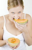 Młoda kobieta z awokado na białym tle. Dzień wegański