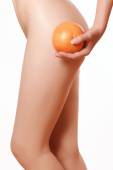 Naga młoda kobieta z grejpfrutami na tle koloru. Dzień wegański
