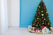 Piękne prezenty na piersi szuflady i gałązki jodły w pobliżu ściany kolor