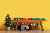 Zdjęcie "Piękny prezent świąteczny na piersi szuflady i gałązki jodły w pobliżu ściany kolor" może być wykorzystywane do celów osobistych i komercyjnych zgodnie z warunkami zakupionej licencji Royalty-free. Obraz jest dostępny do pobrania w jakości wysokiej rozdzielczości do 5760x3840.