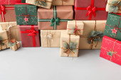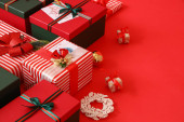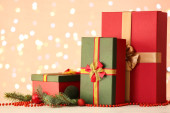Zdjęcie "Piękne prezenty świąteczne w pobliżu ściany kolor" może być wykorzystywane do celów osobistych i komercyjnych zgodnie z warunkami zakupionej licencji Royalty-free. Obraz jest dostępny do pobrania w jakości wysokiej rozdzielczości do 5760x3840.