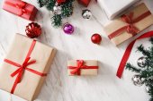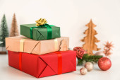Piękne prezenty świąteczne w pobliżu ściany światła