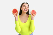 Naga młoda kobieta z ciętym grejpfrutem na białym tle. Dzień wegański