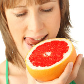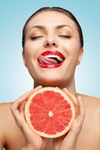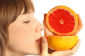 Młoda kobieta z wyciętym grejpfrutem na białym tle. Dzień wegański