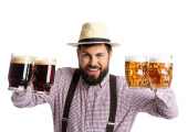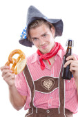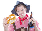 Młody mężczyzna w tradycyjnych niemieckich ubraniach z piwem i preclami na tle liliowym