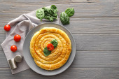 Zdjęcie "Smaczny placek warzywny na drewnianym tle" może być wykorzystywane do celów osobistych i komercyjnych zgodnie z warunkami zakupionej licencji Royalty-free. Obraz jest dostępny do pobrania w jakości wysokiej rozdzielczości do 5760x3840.