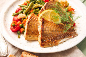 Płyta smacznych ryb okonia morskiego z warzywami na jasnym tle